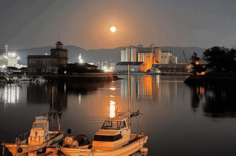 満月を少し過ぎた12月の坂出港西運河地区^_^奥の見える洋館 …