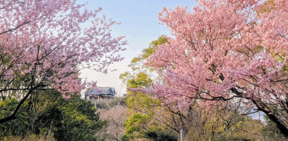 坂出市にある河津桜に彩られた雲井御所。崇徳上皇が3年間滞在さ …