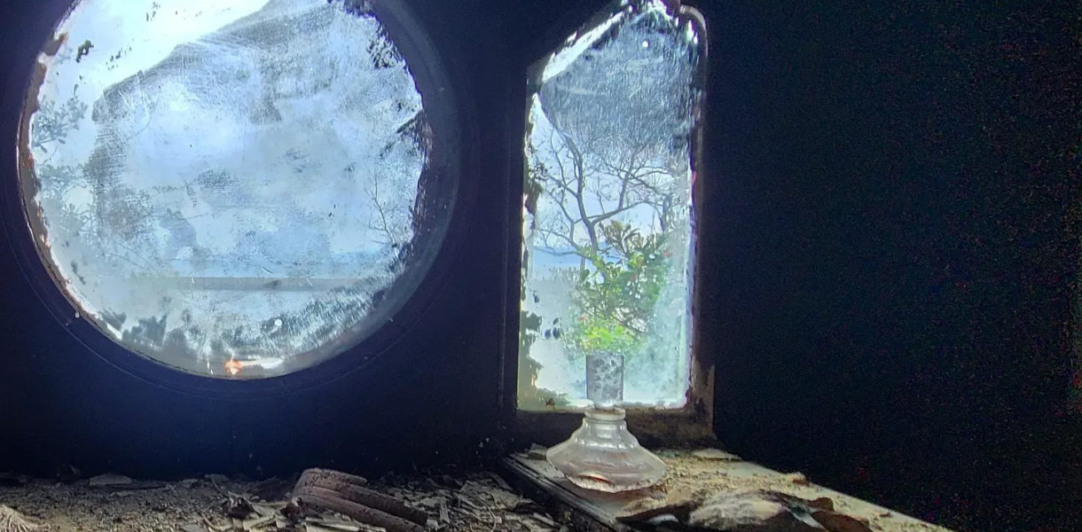 ヤシの木の海岸沿いにひっそりとした洋館の廃屋。そこが展示会場 …